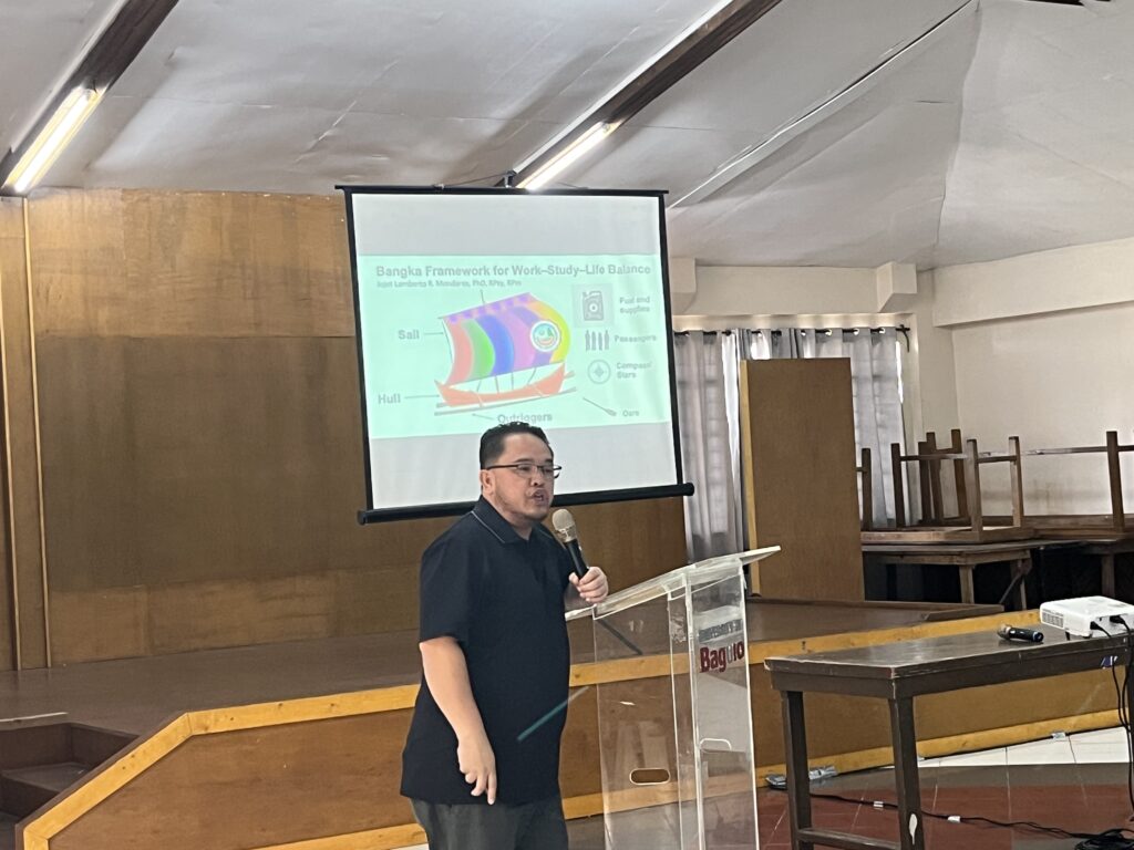 Dr. Mondares likened the graduate student journey to a sea voyage on a bangká, introducing a framework with seven essential parts: the hull (boundaries), sail (integration), outriggers (emotional balance), passengers (role prioritization), compass/stars (cultural anchors), fuel and supplies (resource stewardship), and oars (intentional life crafting). He encouraged students to reflect on whether their “boat” was steady, overloaded, or adrift, inspiring them to strengthen their balance to thrive academically and personally.